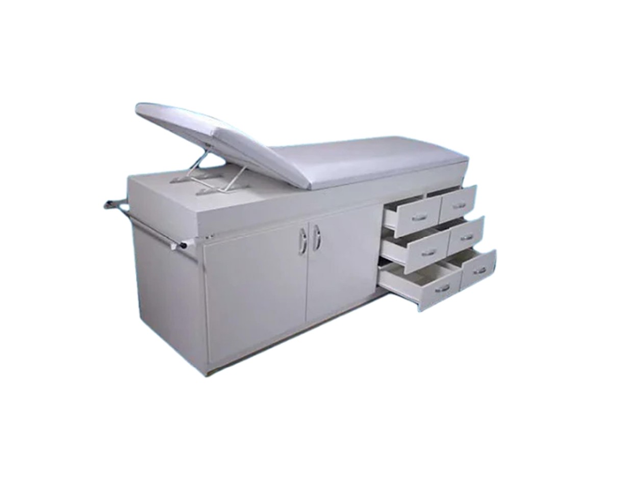 FABRICADA EM PLACA DE FIBRA DE MÉDIA DENSIDADE (MDF) DE ESPESSURA DE 15 MM COM REVESTIMENTO MELAMÍNICO DE BAIXA PRESSÃO (BP), OFERECE GABINETE COM ARMÁRIO COM 2 PORTAS E 6 GAVETAS PARA ARMAZENAMENTO DE INSTRUMENTAL E MATERIAIS UTILIZADOS NA REALIZAÇÃO DOS EXAMES.